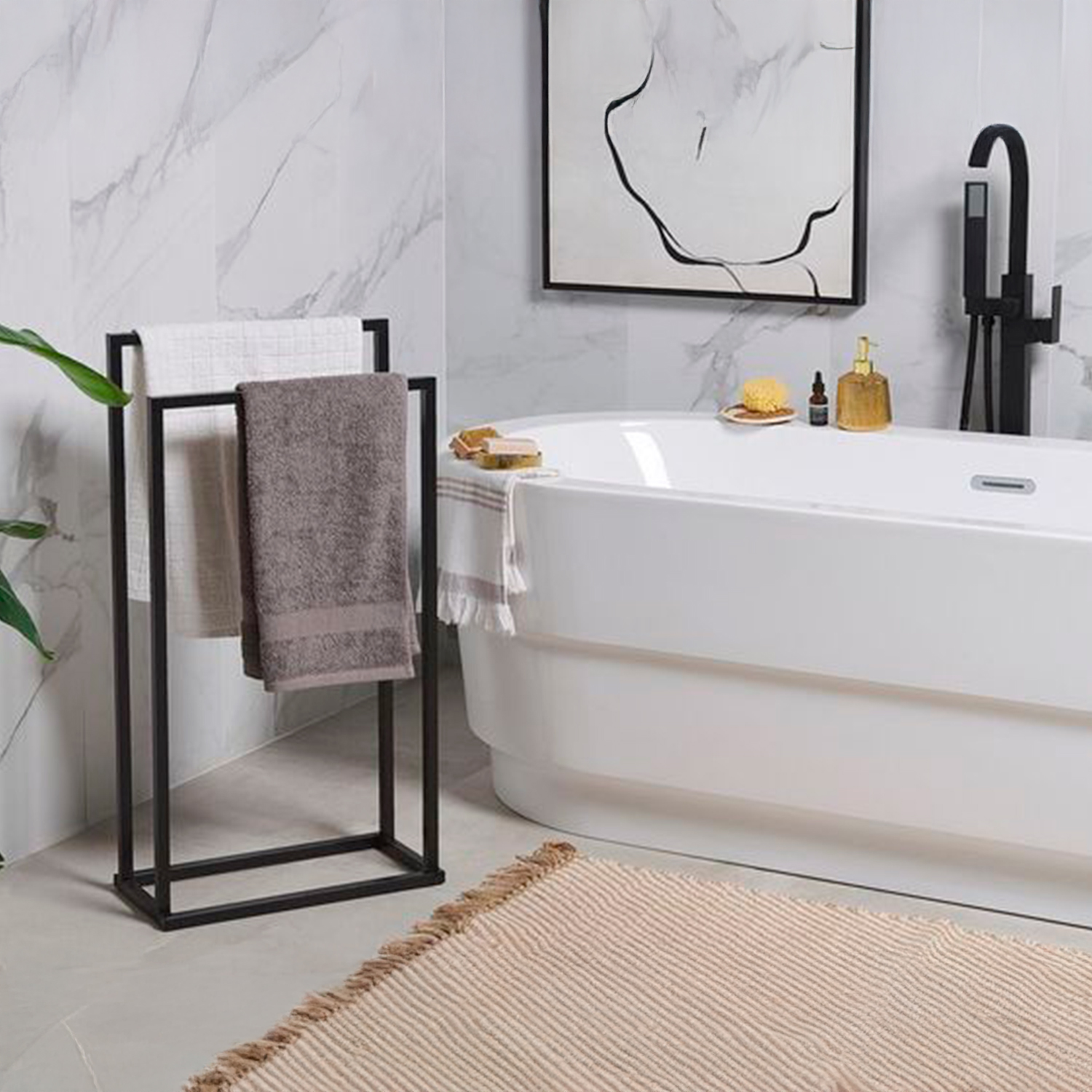 O Toalheiro de Chão Duplo Califa foi desenvolvido para oferecer praticidade e organização ao banheiro, combinando funcionalidade com um design moderno e elegante. Sua estrutura minimalista permite que o produto se integre facilmente a diferentes estilos de decoração.